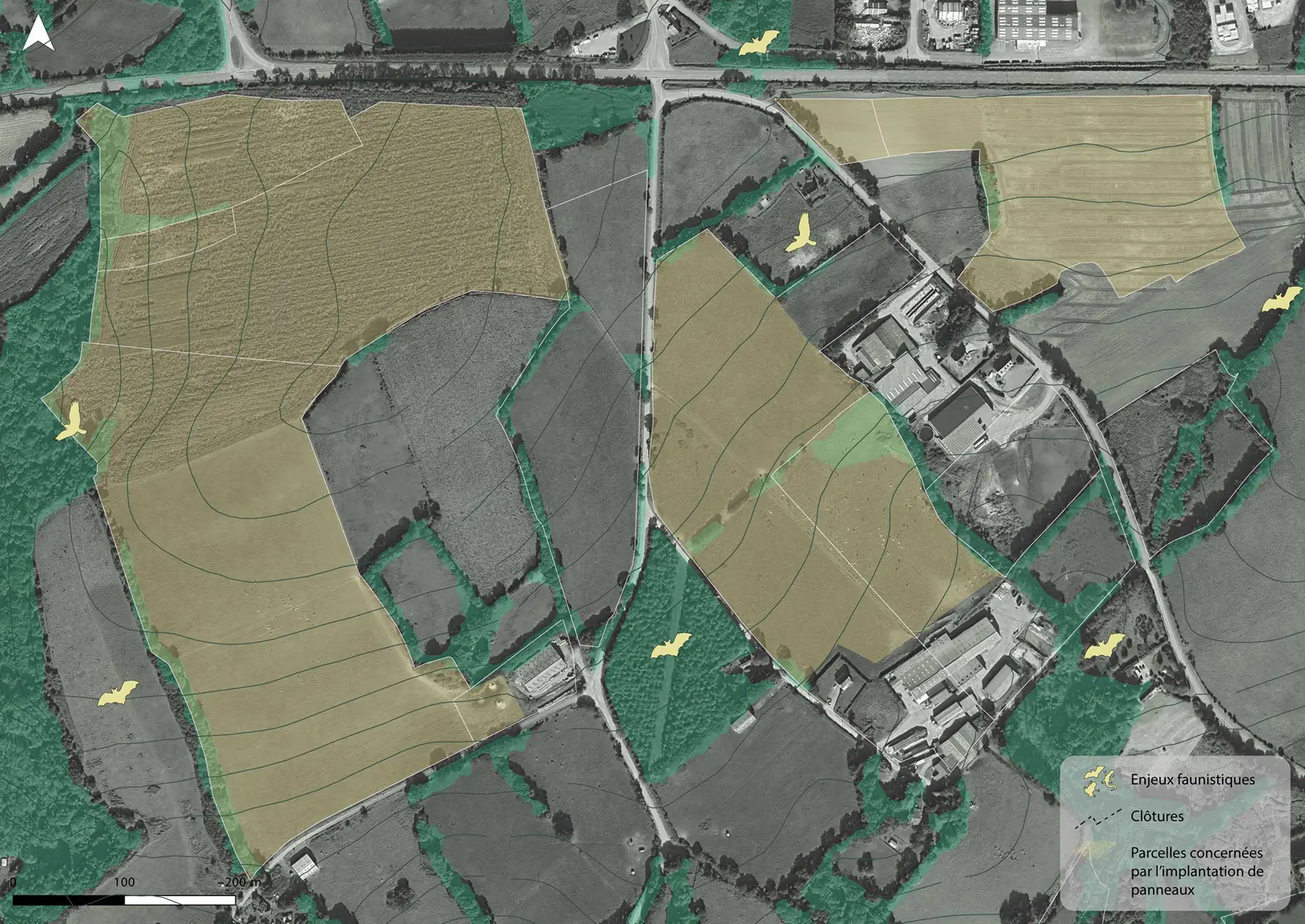 L’étude des habitats naturels et espèces a permis de mettre en évidence des enjeux écologiques principalement en bordure de l’aire d’étude immédiate. Afin de préserver la biodiversité existante, des mesures d’évitement et d’éloignement des zones les plus sensibles ont été prises en compte afin de limiter au maximum les impacts sur les habitats, les zones humides et les espèces protégées. L’implantation des panneaux ne concernent pas les principales zones à enjeux environnementaux : des mesures d’évitement et de réduction étant mises en place. Une zone tampon sans structures autour des milieux naturels (environ 20m). Les trames végétales (haies, bois) existantes sont conservées. Une zone humide a été recensée sur le site de l’étude : aucune implantation n’est prévue sur ces zones (mesures d’évitement).